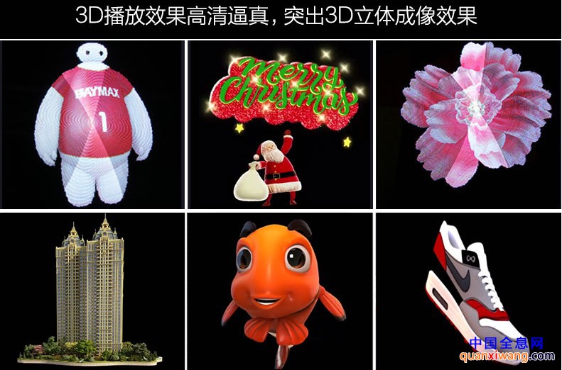 產品具有三維立體的效果,空中成像,立體懸浮,不需要配戴眼鏡和頭盔即可欣賞3D的效果。產品新穎獨特,可隨時更換內容。 安裝簡單,攜帶方便 多場合通用 多地點展示 多次數循環 肉眼直觀隨處可見 覆蓋面廣信息量大 安裝簡單、攜帶方便
