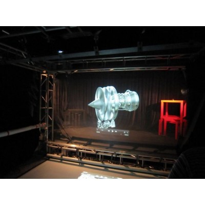 全息幻影成像系統是是利用光學錯覺原理,將電影中用馬斯克攝像技術所拍攝的影像(人、物)與布景箱中的主體模型景觀合成?;凇皩嵨锬P汀焙汀傲Ⅲw幻影”的光學成像結合,把拍攝的活動人像疊加進場景之中,構成了動靜結合的影視畫面。使之獲得一種“立體幻影”與實物模型結合及相互作用的逼真的視覺效果。配上三維聲音、燈光、氣味、 煙霧等,使其更加惟妙惟肖。