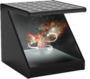 ??柜體時尚美觀,有科技感;頂端四面透明,真正的空間成像;色彩鮮艷,對比度,清晰度高;有空間感,感,形成空中幻象;中間可結合實物,實現影像與實物的結合;也可配加觸摸屏實現與觀眾的互動;