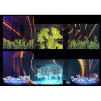 以建筑或定制模型為媒介,配合三維實物本身的線條和棱角,再結(jié)合投影影像立體交互,營造出夢幻多變的三維立體特效互動舞臺。