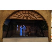 全息幻影成像系統(tǒng)是是利用光學(xué)錯(cuò)覺(jué)原理,將電影中用馬斯克攝像技術(shù)所拍攝的影像(人、物)與布景箱中的主體模型景觀合成。基于“實(shí)物模型”和“立體幻影”的光學(xué)成像結(jié)合,把拍攝的活動(dòng)人像疊加進(jìn)場(chǎng)景之中,構(gòu)成了動(dòng)靜結(jié)合的影視畫(huà)面。使之獲得一種“立體幻影”與實(shí)物模型結(jié)合及相互作用的逼真的視覺(jué)效果。配上三維聲音、燈光、氣味、 煙霧等,使其更加惟妙惟肖。