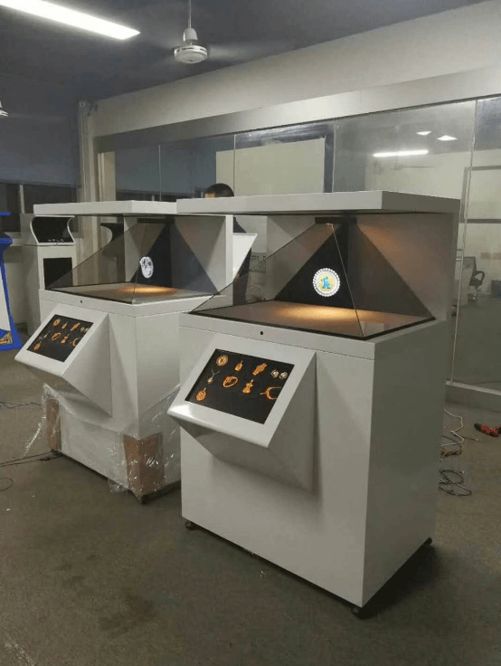 柜體時尚美觀,有科技感;頂部四面透明,真正的空間成像;色彩鮮艷,對比度,清晰度高;有空間感,感,形成空中幻象;中間可結合實物,實現影像與實物的結合;也可配加觸摸屏實現與觀眾的互動