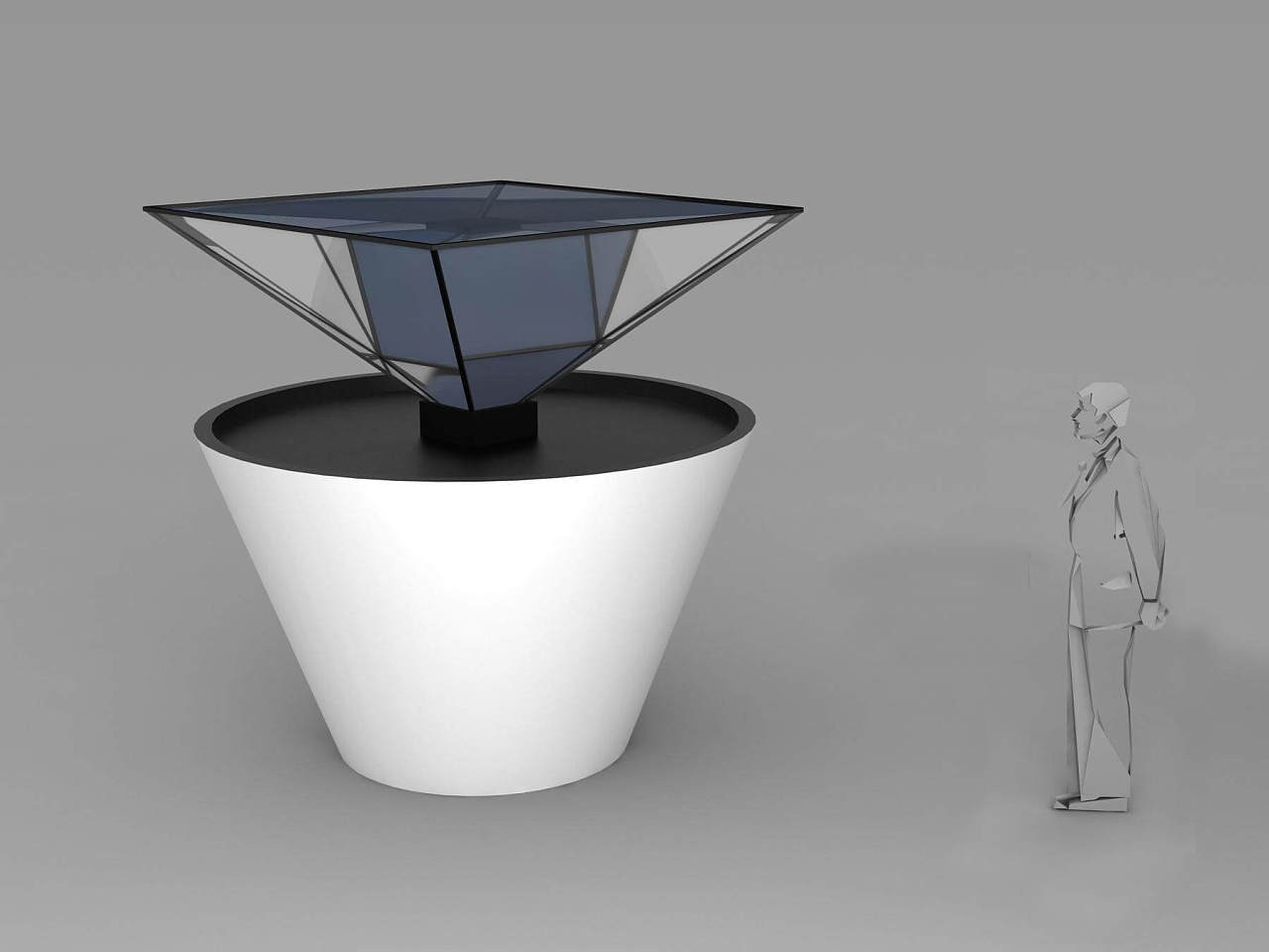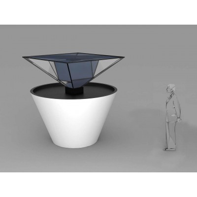 360全息柜也被稱之為四面全息展示柜金字塔全息、全息三維成像,有正三角和倒三角之分它是由透明全息玻璃材料制成的四面錐體,觀眾的視線能從任何—面穿透它,觀眾能從錐形空間里看到自由飄浮的影像和圖形。四面視頻成像將光反射到這個錐體中的特殊棱鏡上,匯集到一起后形成具有真實維度空間的立體影像。